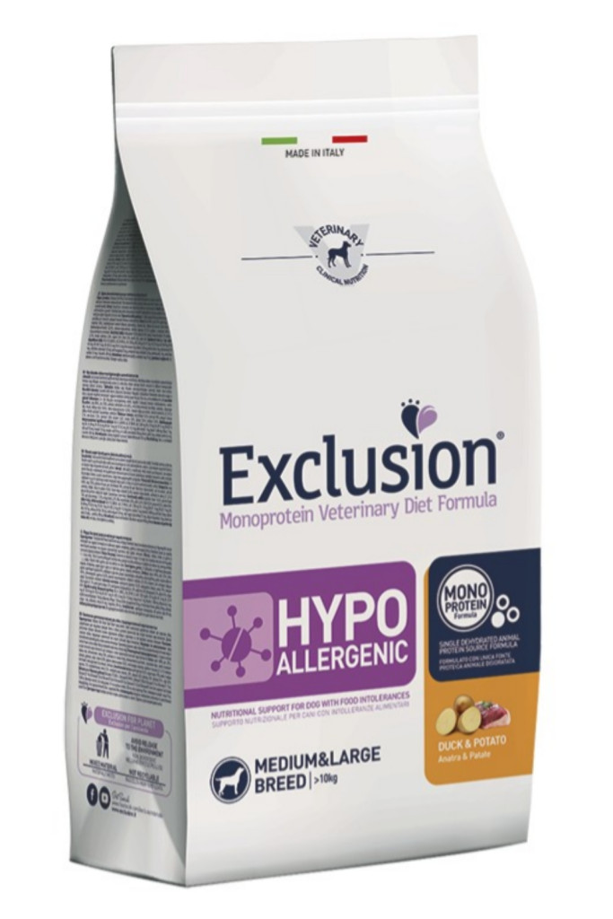 Az Exclusion Hypoallergenic duck & potato small breed (kacsa és burgonya) egy hipoallergén eledel, közepes és nagytestű, felnőtt kutyák számára. Kiválóan alkalmas eleségallergia, vagy táplálék-intolerancia esetén.
