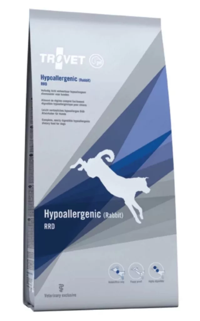 A Trovet Hypoallergenic Rabbit egy teljes értékű, diétás száraztáp táplálékérzékenységben szenvedő kutyák számára, ízletes nyúlhússal és rizzsel.